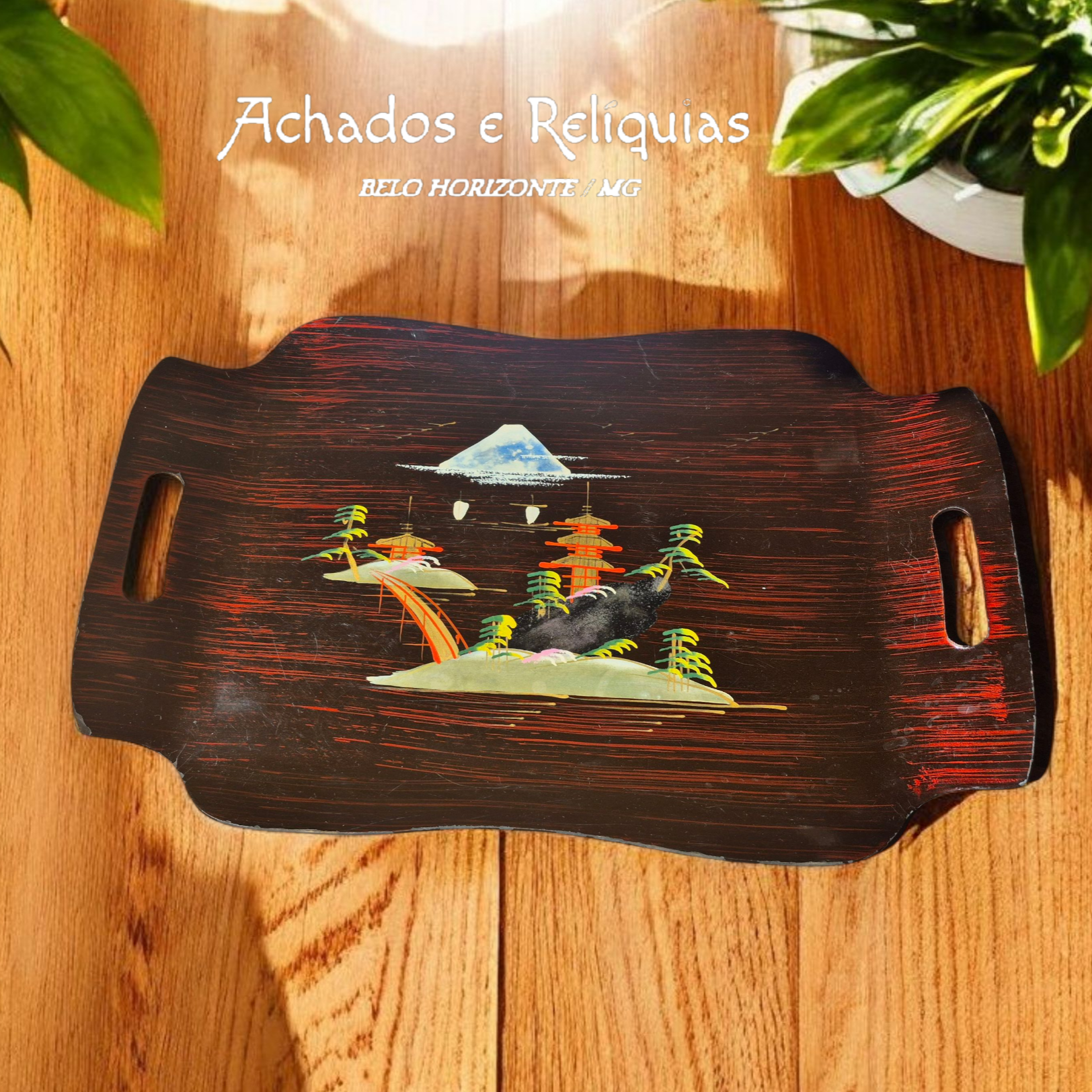 Bandeja grande em melanina, verdadeira joia retrô, trazendo consigo o encanto de tempos passados. Sua superfície escura, com efeito que lembra madeira, é cenário para uma delicada pintura de inspiração oriental: pontes vermelhas, pagodes, árvores estilizadas e uma montanha nevada ao fundo, como se fosse uma pequena janela para um jardim distante.