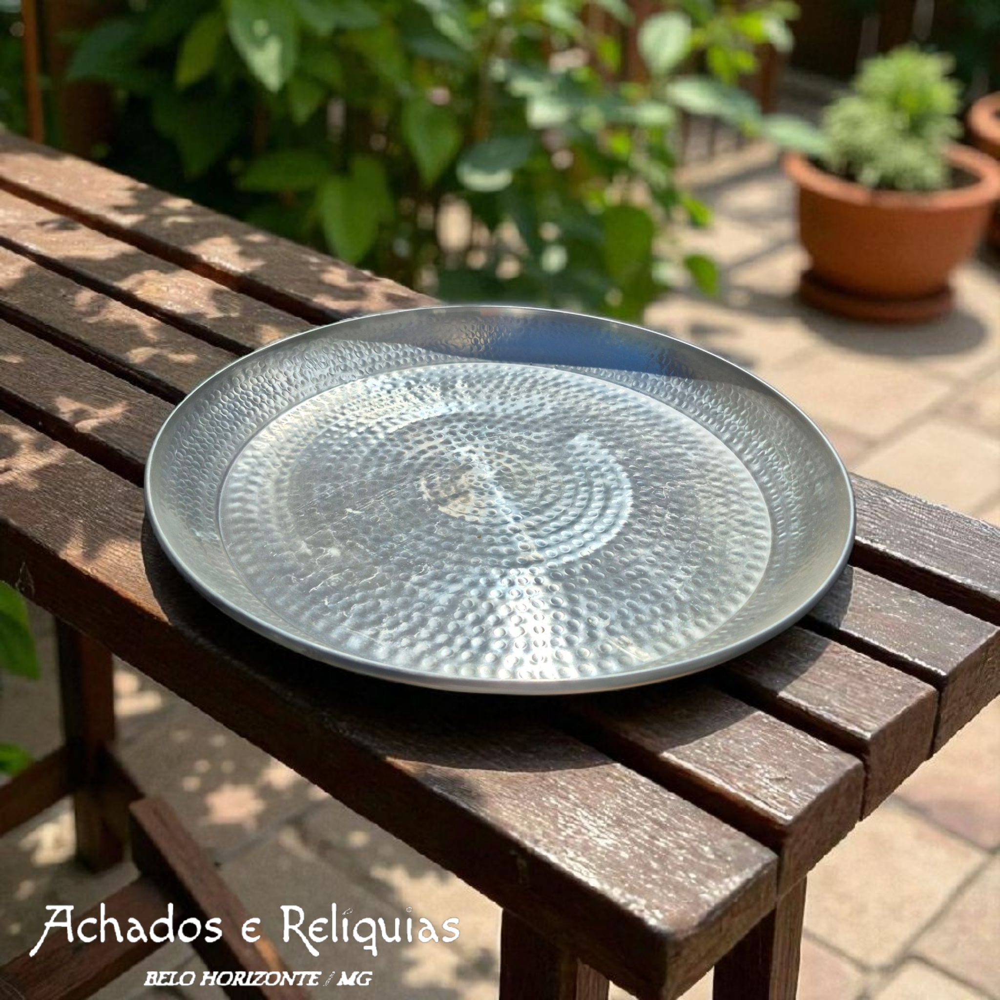 Mais que uma bandeja, um espetáculo de alumínio martelado. Serve muito, decora mais com charme atemporal.