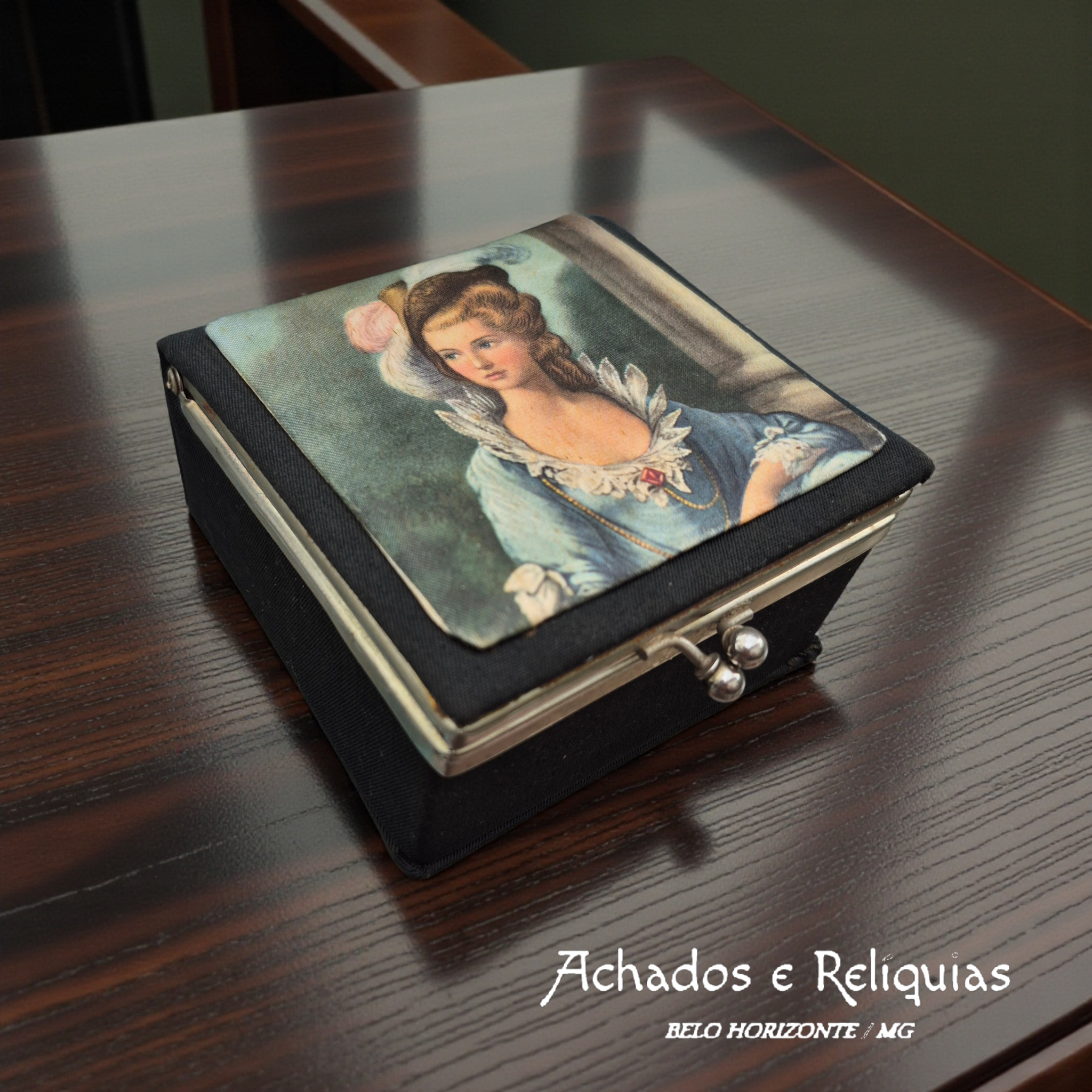 Esta delicada caixa em tecido resgata a poesia dos antigos estojos de toucador. Seu topo exibe um retrato clássico de uma jovem dama inspirado nos elegantes retratos pintados à mão do período oitocentista, acrescentando um toque romântico e nostálgico a qualquer ambiente.