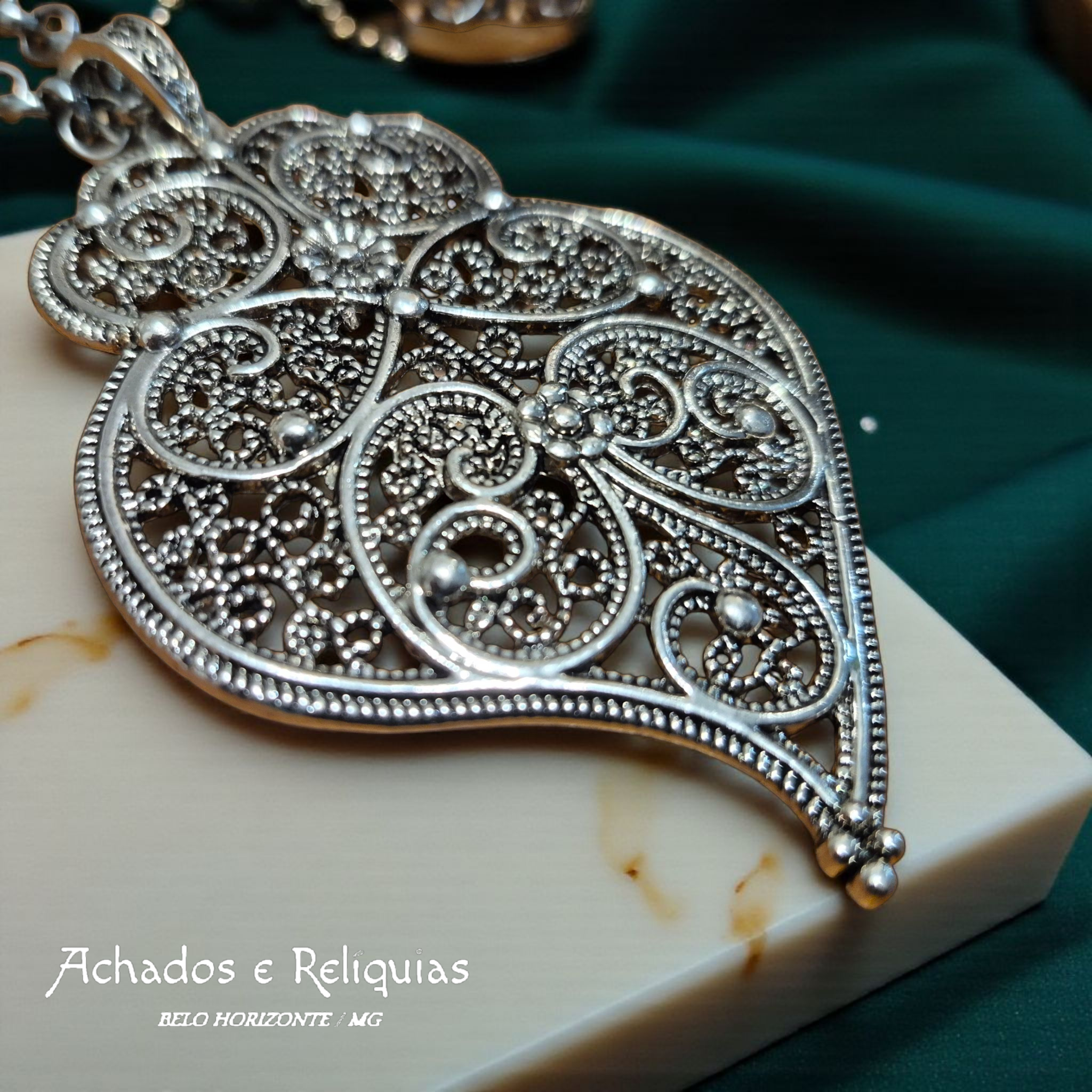 Coração em estilo filigrana, com arabescos que lembram rendas antigas e luz que dança pelos detalhes. A corrente de elos marcados cria um belo contraste entre delicadeza e presença, resultando em um acessório que se destaca sem pedir atenção. Um pingente que sugere histórias, memórias e gestos guardados no peito. Perfeito para quem gosta de peças que falam com o olhar — discretas, mas cheias de personalidade.