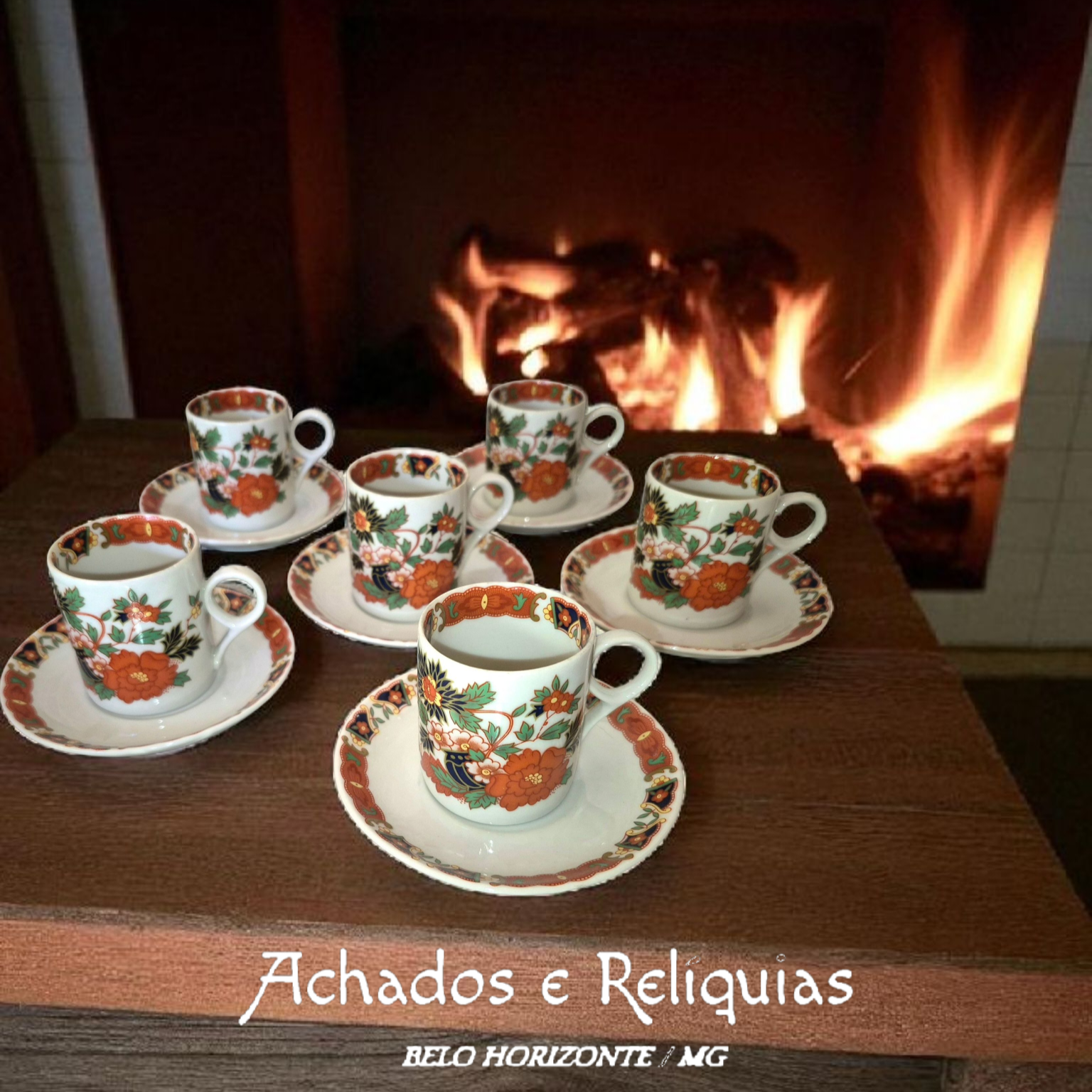 Cada peça guarda em seu corpo delicado a arte dos florais em tons quentes, como se o café servido nelas viesse acompanhado da própria luz do jardim. A borda decorada em cores vivas revela o cuidado da produção artesanal da época, quando a porcelana era pensada não apenas para servir, mas para encantar.