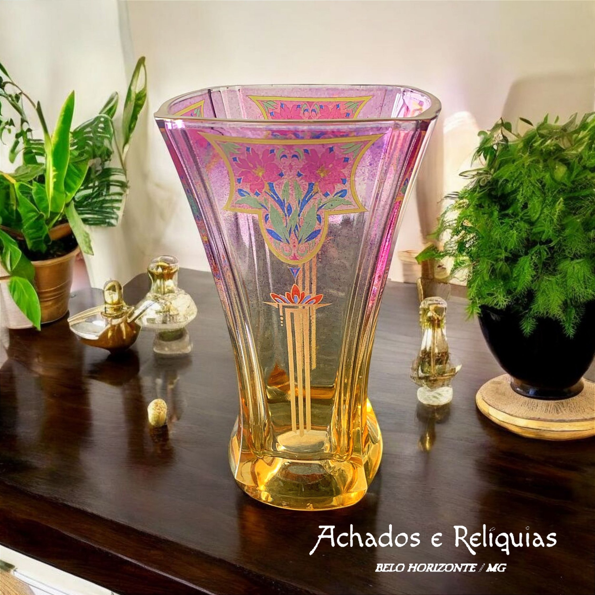 Elegante vaso Art Nouveau em vidro decorado, com detalhes rosas e dourados e pinturas florais em tons vibrantes.
