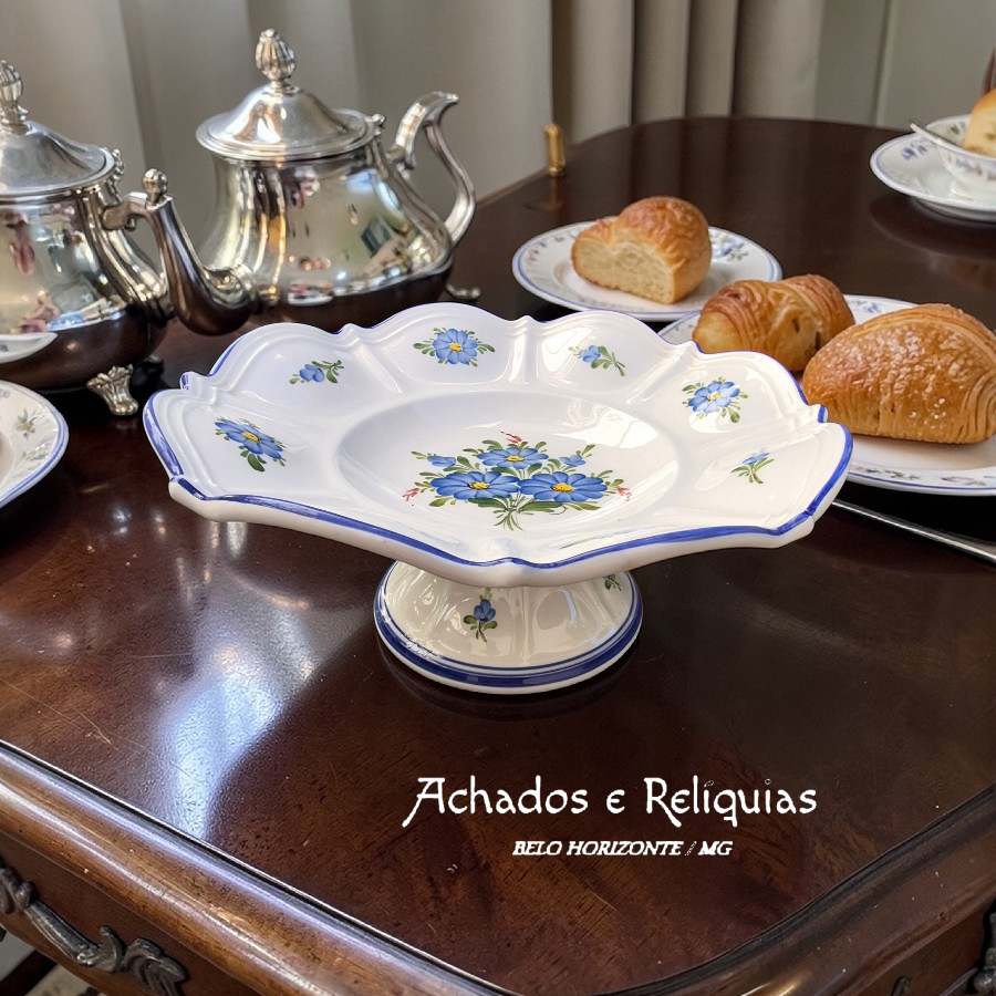 Confeccionada em cerâmica esmaltada, a fruteira apresenta modelagem orgânica com bordas onduladas que evocam o movimento suave de pétalas florais. Seu processo de produção envolve moldagem, queima em forno cerâmico e posterior aplicação de esmalte vitrificado, responsável pelo brilho e pela resistência do acabamento. A decoração floral em tons de azul, com detalhes em verde e amarelo, é aplicada manualmente, conferindo singularidade e autenticidade à peça.