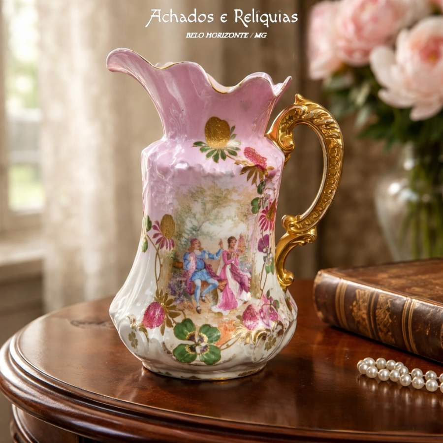 A peça é decorada à mão, com cena galante assinada RIP — representação elegante e romântica de figuras em trajes refinados, evocando momentos de convívio, lazer e cortejo em paisagem bucólica — aplicada por atelier especializado, prática comum em Limoges, onde a porcelana era produzida em branco e posteriormente confiada a artistas decoradores. A composição central é ladeada por guirlandas florais em policromia, com detalhes minuciosos e dourações em relevo, que conferem profundidade, brilho e sofisticação ao conjunto. A alça exuberante, inteiramente dourada, reforça o caráter ornamental e escultórico da jarra.