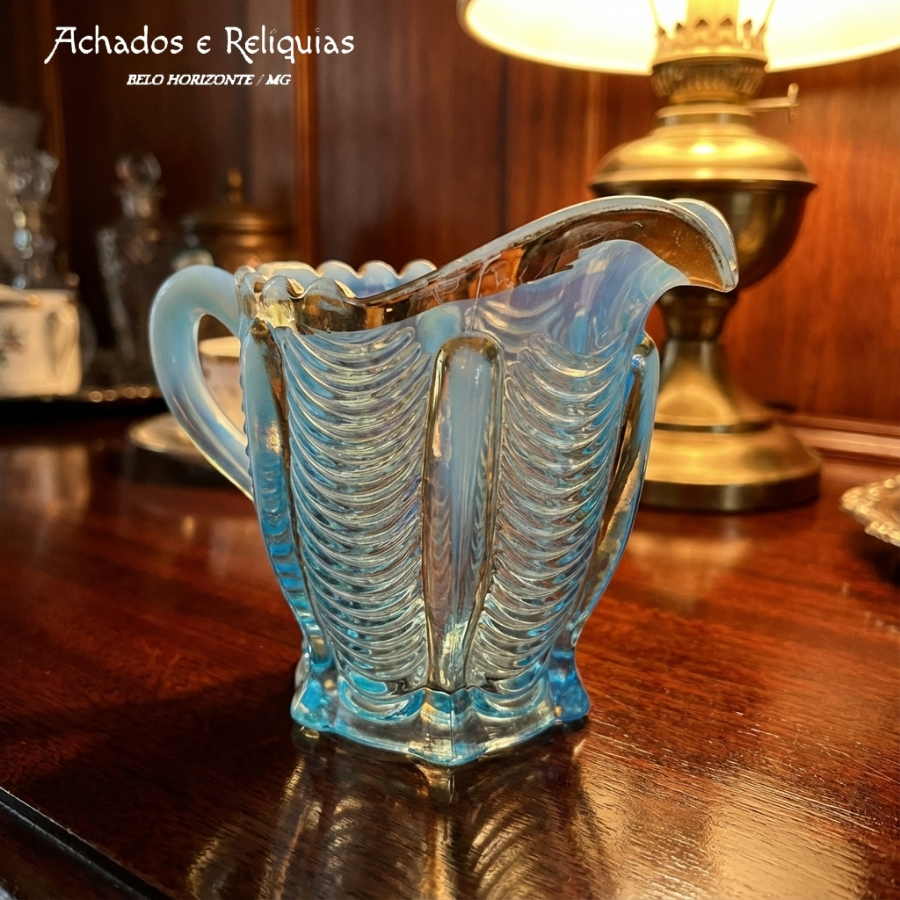 Produzida pela Northwood Glass Company, nos Estados Unidos, manufatura ativa entre 1887 e 1925, esta cremeira foi moldada em vidro prensado de alta qualidade e posteriormente lapidada, técnica que confere definição às curvas, profundidade visual e um jogo de luz sofisticado. Os detalhes dourados, aplicados manualmente, acrescentam nobreza e reforçam seu caráter decorativo e funcional.