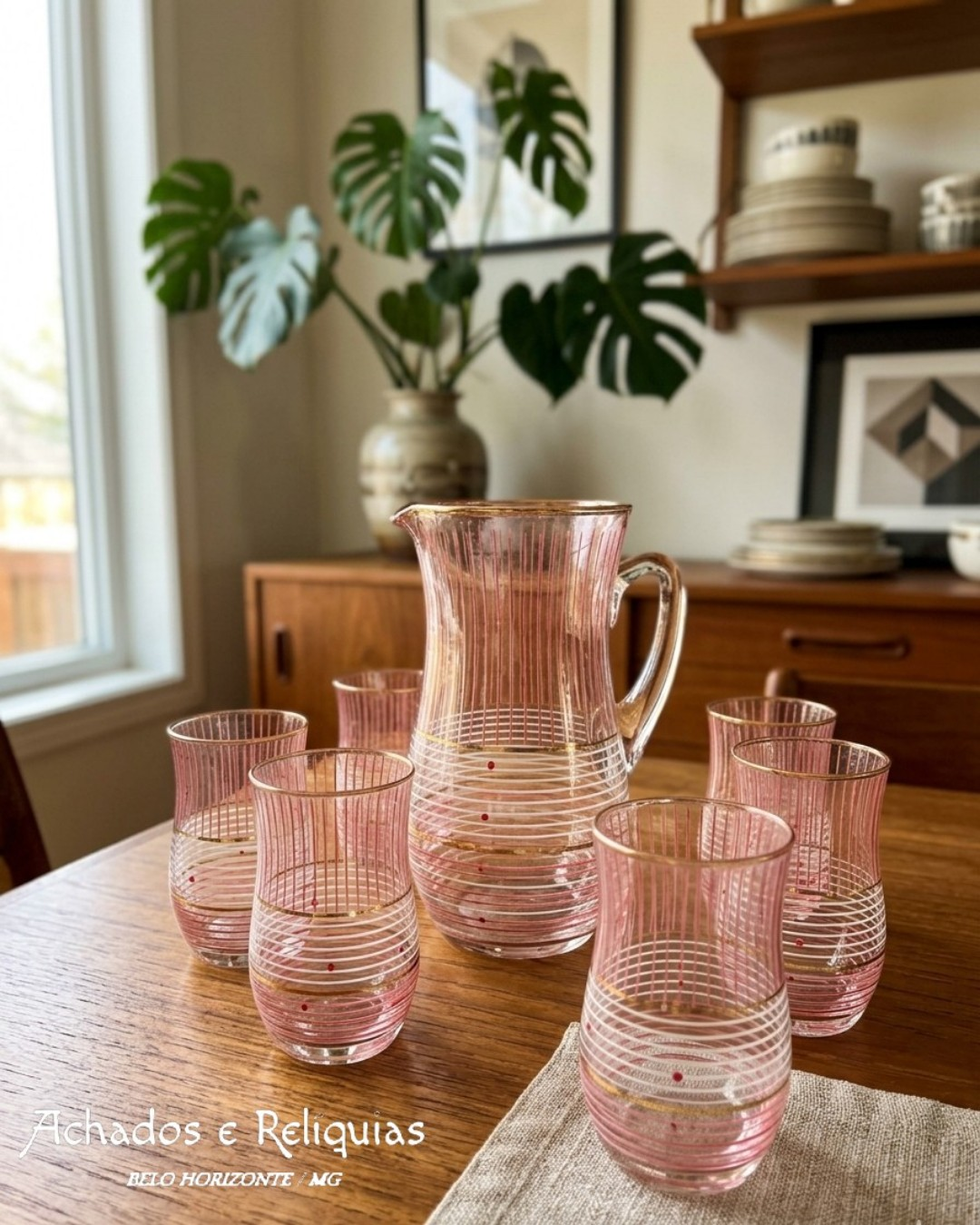 Com linhas que evocam o refinamento das décadas de 50 e 60, a jarra e os copos apresentam uma geometria delicada, onde o rosa suave se cruza com anéis brancos e detalhes em ouro.