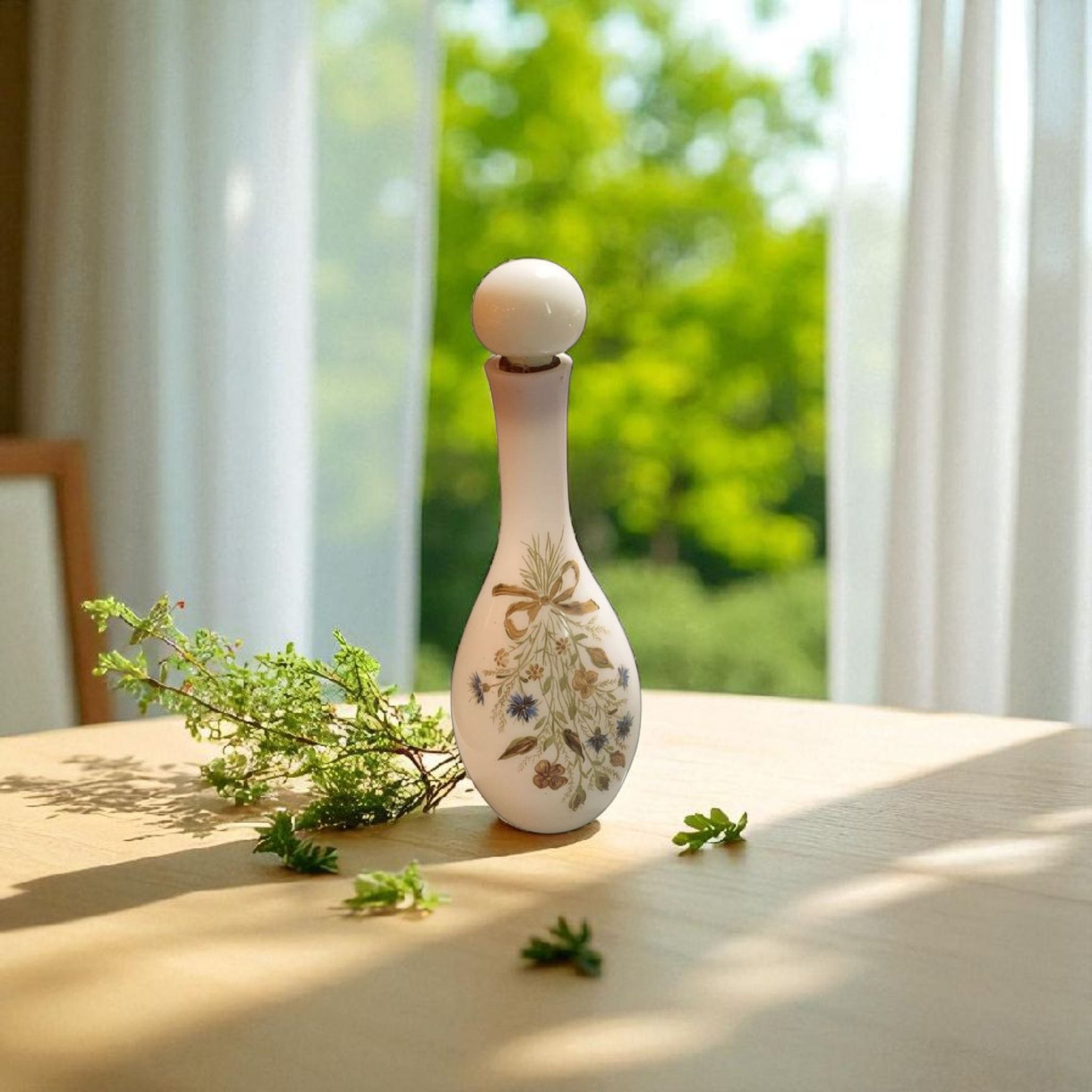 Com aproximadamente 23 cm de altura, apresenta forma esguia e tampa original em opalina, mantendo a suavidade leitosa característica do vidro. Os detalhes em dourado e as flores policromadas revelam a sofisticação da época, ainda que tragam sinais e desgastes naturais do tempo, que só reforçam seu valor como objeto de coleção e decoração.