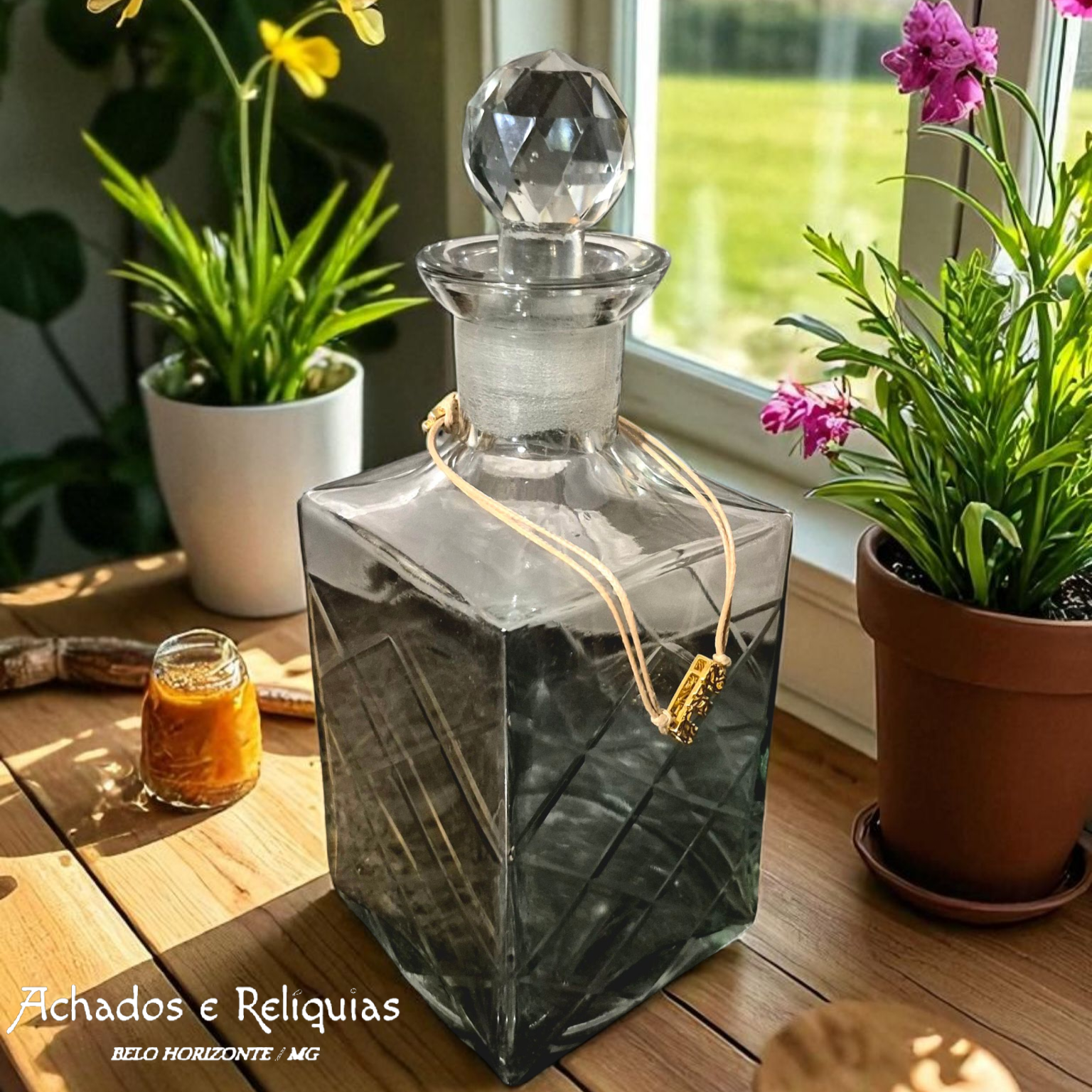 Esta é uma elegante garrafa de vidro transparente com design clássico, corpo quadrado e entalhes em padrão diagonal, conferindo um ar sofisticado e vintage à peça. A tampa, feita do mesmo vidro espesso e lapidado, possui um acabamento facetado que lembra um cristal, complementando com charme o conjunto. Amarrado ao gargalo, há um cordão claro com um pequeno pingente dourado decorativo, que remete a detalhes artesanais ou simbólicos. Uma peça que combina funcionalidade e estilo, ideal para servir bebidas finas como Licores, Uísque, Conhaque, Rum envelhecido, Grappa ou outras aguardentes refinadas, ou como item decorativo em ambientes retrô ou colecionáveis.