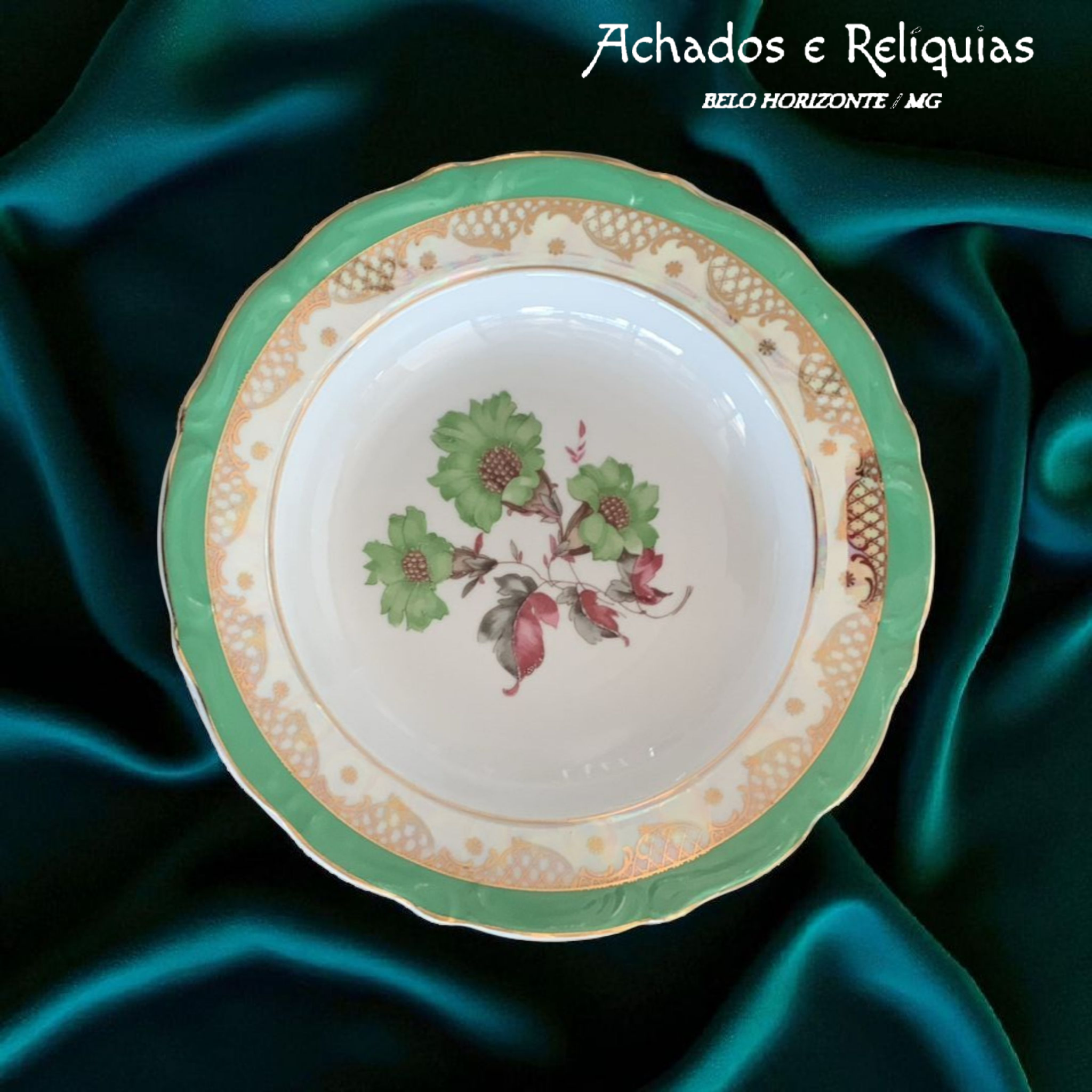 Lindo Jogo de Pratos Steatita Paraná – porcelana fina em tons de verde e douração manual, brilho iridescente, charme atemporal e decoração floral.