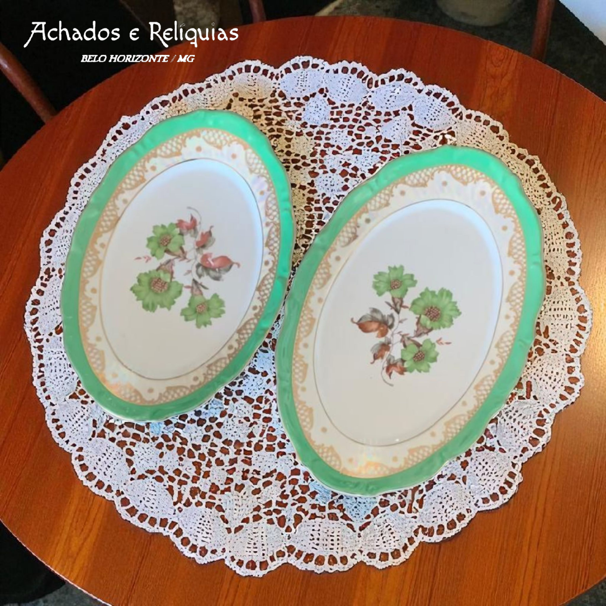 Maravilhosas travessas Steatita Paraná – porcelana fina em tons de verde e douração manual, brilho iridescente, charme atemporal e decoração floral.