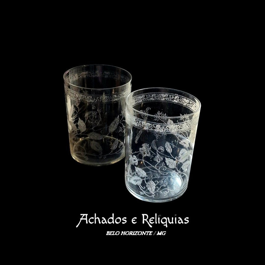Elegante par de copos em cristal translúcido atribuídos à tradicional manufatura francesa Saint-Louis, reconhecida mundialmente pela excelência na produção de cristais finos desde o século XVIII. As peças apresentam decoração delicadamente gravada com flores, folhas e arabescos entrelaçados, formando um desenho contínuo que envolve todo o corpo do copo e confere leveza visual à transparência do cristal.