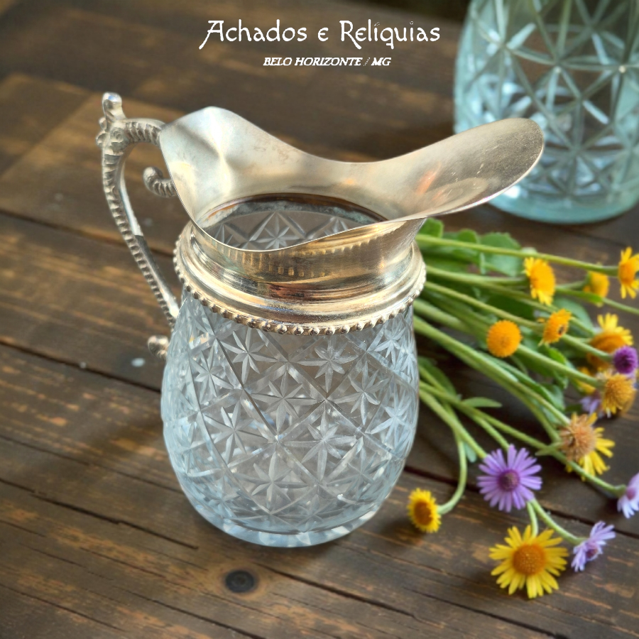 Delicada e cheia de presença, esta pequena jarra encanta à primeira vista pela harmonia entre o brilho do vidro lapidado e a elegância do metal espessurado a prata. Seu corpo de lateral abaulada revela uma lapidação minuciosa em talhos geométricos, formando losangos e estrelas que captam a luz e criam reflexos sofisticados, remetendo à tradição das mesas clássicas europeias.