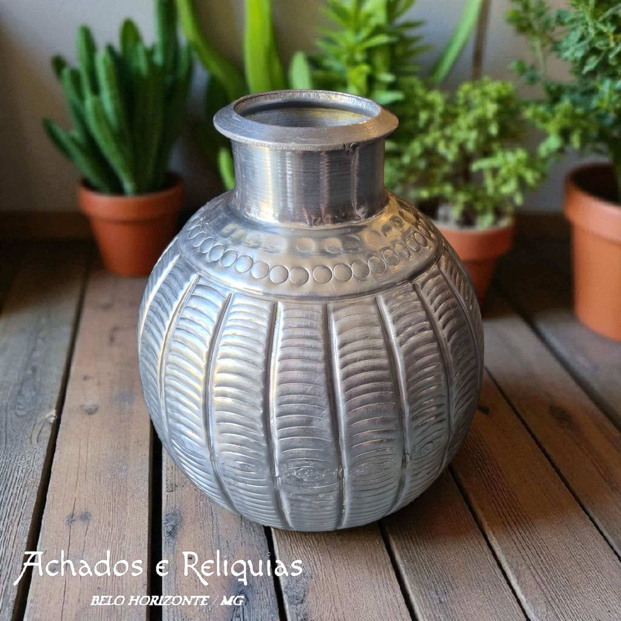 Com formato arredondado e linhas verticais em relevo, este vaso indiano em metal evoca formas naturais como folhas ou escamas. Feito artesanalmente, seu cinzelamento cria um ritmo visual que capta a luz com elegância.